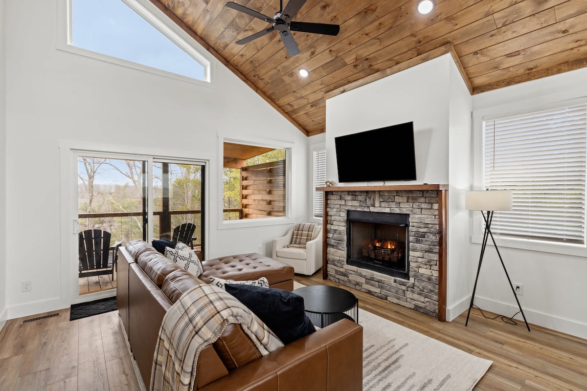 Erlebe einen romantischen Rückzugsort auf dem Bergrücken mit atemberaubendem Blick auf den Sonnenuntergang und den See. Diese Hütte bietet einige der besten Aussichten in ganz Red River Gorge. Entspanne dich im Whirlpool, entspanne dich in der Sauna auf der Dachterrasse und genieße deine eigene Dachterrasse hoch über den Bäumen. Beende den Abend am Innenkamin oder koche ein Gourmet-Menü in der gut ausgestatteten Küche. Perfekt für Paare oder kleine Familien, die sich nach einem luxuriösen Rückzugsort mit einzigartigen Annehmlichkeiten, einer ruhigen Umgebung und atemberaubenden Ausblicken aus jedem Blickwinkel sehnen.