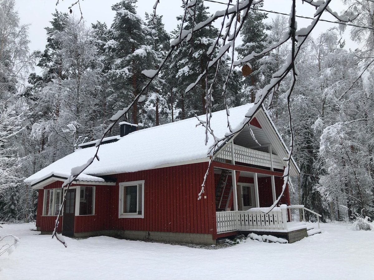 Verbringe deinen Urlaub mit Freunden und Familie oder ein romantisches Wochenende mit deinem Liebsten am Kamin, umgeben von schöner Tierwelt. Ein kleines und gemütliches Haus im Wald erwartet dich. Es gibt eine Sauna, einen Holzofen, eine voll ausgestattete Küche, eine Waschmaschine, ein Sofa im Erdgeschoss (Platz für 2 Personen ), ein Doppelbett und ein Einzelbett im ersten Stock, Bettwäsche ist vorhanden, WLAN. Der nächste See bietet einen 13-minütigen Spaziergang durch den Wald entlang eines schönen Weges.