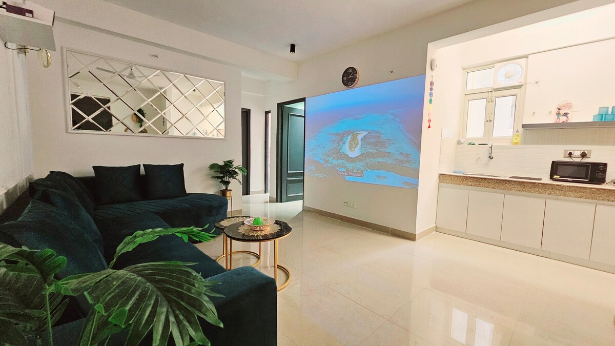 Gurgaon's favourite couple retreat at Sapphire 83. Order custom cakes, flower bouquets, room décor and photography directly through our guest portal. Enjoy stylish living area with books & games, fully loaded kitchen, beautiful bedroom with TV/OTT. Work or relax with a dedicated workstation & 200+ Mbps WiFi. Step onto open-view balcony for skyline views. Strategic location near NH48, Dwarka Exp, SPR, Amex, Air India, TCS. Inox, pubs, restaurants and mall level convenience are steps away.