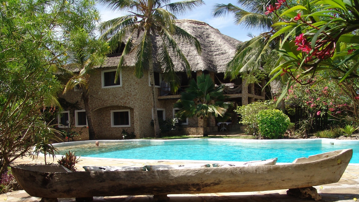 KOCH, HAUSWIRT UND REINIGUNGSDIENST INKLUSIVE Exklusive Villa mit engagiertem Personal, umgeben von viel Grün, nur 400 Meter vom kenianischen Meer und Korallenriff entfernt. Verteilt auf zwei Etagen, verfügt es über einen Swimmingpool mit Sonnenterrasse, Liegestühlen und einem Pavillon für Mahlzeiten im Freien. 3 geräumige Schlafzimmer mit Kingsize-Betten, Moskitonetzen, eigenen Badezimmern, Ventilatoren und Kleiderschränken. Voll ausgestattete Küche, Parkplatz und Selbstversorgung mit Wasser, Strom und Gas. Herzliches, professionelles Personal sorgt für einen unvergesslichen Aufenthalt.