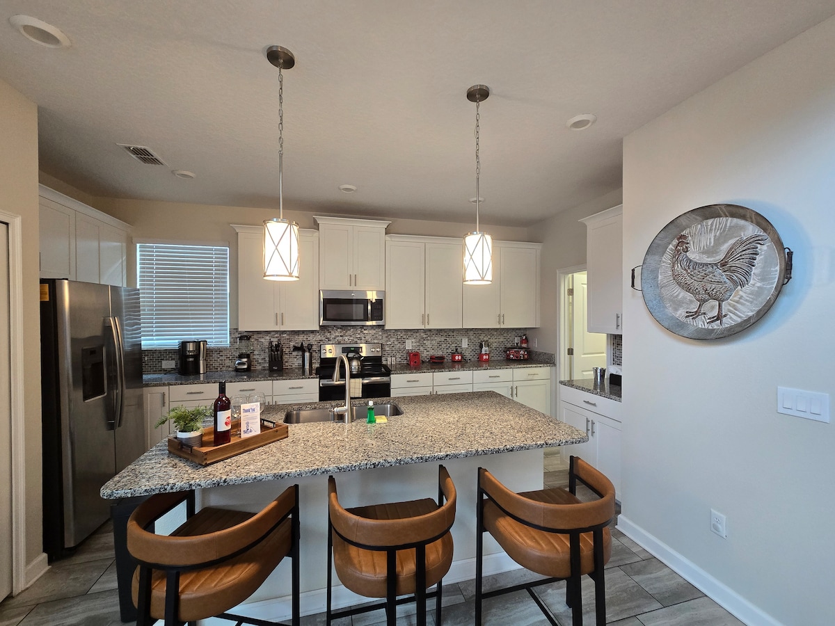 Willkommen in unserer stilvollen Oase in Kissimmee, die Raffinesse mit einer entspannten Atmosphäre verbindet. Dein Aufenthalt beginnt in einer professionell gereinigten Wohnung zu deinem vollen Vergnügen. Entdecke Annehmlichkeiten im Resort-Stil – einen glitzernden Pool, ein Fitnesscenter und Hängematten, die den Luxus eines Fünf-Sterne-Retreats bieten. Günstig gelegen, nur wenige Gehminuten von Themenparks, Restaurants und Einkaufsmöglichkeiten entfernt. Wir freuen uns schon darauf, dich in unserem kleinen Stück vom Paradies begrüßen zu dürfen!