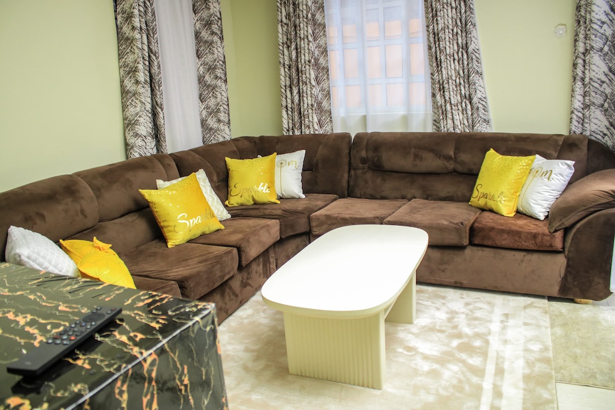 Vergiss deine Sorgen in dieser geräumigen und ruhigen Unterkunft, die eine friedliche Zuflucht und modernen Komfort in der Nähe der Stadt Thika bietet. Wir sind 13 km von Thika und 100 m von der Garissa Road entfernt. Ob du geschäftlich oder privat unterwegs bist, unser gut ausgestatteter Raum bietet alles, was du für einen komfortablen und erholsamen Aufenthalt benötigst. Dazu gehören ein gemütliches Queensize-Bett mit hochwertiger Bettwäsche, eine heiße Dusche mit zuverlässigem Warmwassersystem, eine moderne Küche, in der du kochen kannst, und ein gemütliches Wohnzimmer, das warm und einladend ist.