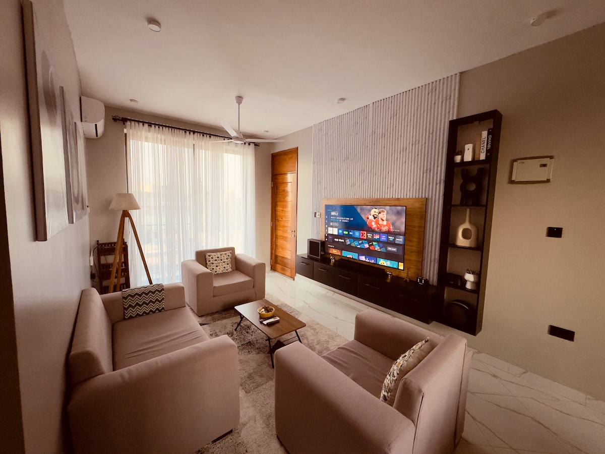 Hab Spaß mit der ganzen Familie in dieser stilvollen Unterkunft. *Wenn du ankommst, erlebst du eine schöne und sichere Lage, 15 Minuten vom Strand entfernt. *Geräumige zwei Schlafzimmer mit allem, was du brauchst. *Kostenloses WLAN, SMART-TV, Standby-Generator, kostenlose Parkplätze und Sicherheitsdienst rund um die Uhr. *Flexible Check-in- und Check-out-Zeiten, wenn möglich. *In der Nähe von Supermärkten, Restaurants, Cafés und lokalen Sehenswürdigkeiten.