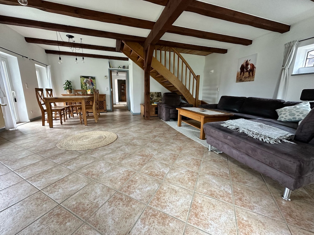 Gemütliche Ferienwohnung (ca. 75 bzw. 90 m²) in denkmalgeschütztem Fachwerkhaus. Großzügige, voll ausgestattete Küche mit Kachelofen, Wohnzimmer mit Schlafcouch, Leseecke und Kachelofen, 1 Schlafzimmer (1-2 Personen) oder 2 Schlafzimmer (ab 3 Personen), jeweils mit Doppelbett, Badezimmer mit Dusche und Sauna. WLAN in der ganzen Wohnung mit kostenlosem Internetzugang. Zentralheizung in allen Zimmern. Eigener Garten. Gegen Aufpreis verfügbar: Transfer v.Bhf,Einkaufservice,Leihfahrräder, Kanus,Gym