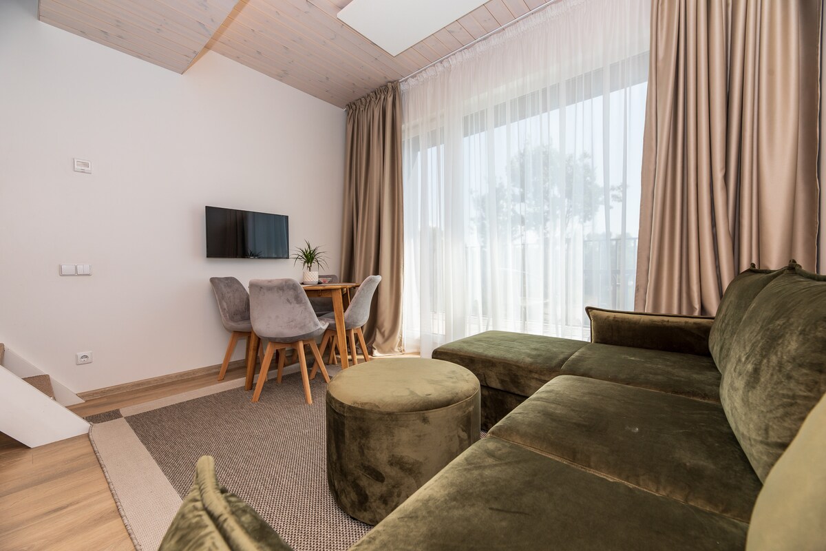 2021 metų statybos, naujai ir pilnai įrengtas dviejų kambarių butas per du aukštus su 6 miegamosiomis vietomis, virtuve ir šildomu baseinu lauke. Apartamentuose įrengtas miegamasis su dvigule lova ir antrasoleje dviejų viengulių lovų miegamasis. Svetainė sujungta su virtuvėle, kurioje rasite visą reikalingą buitinę techniką, taip pat dvigulę sofą ir televizorių.