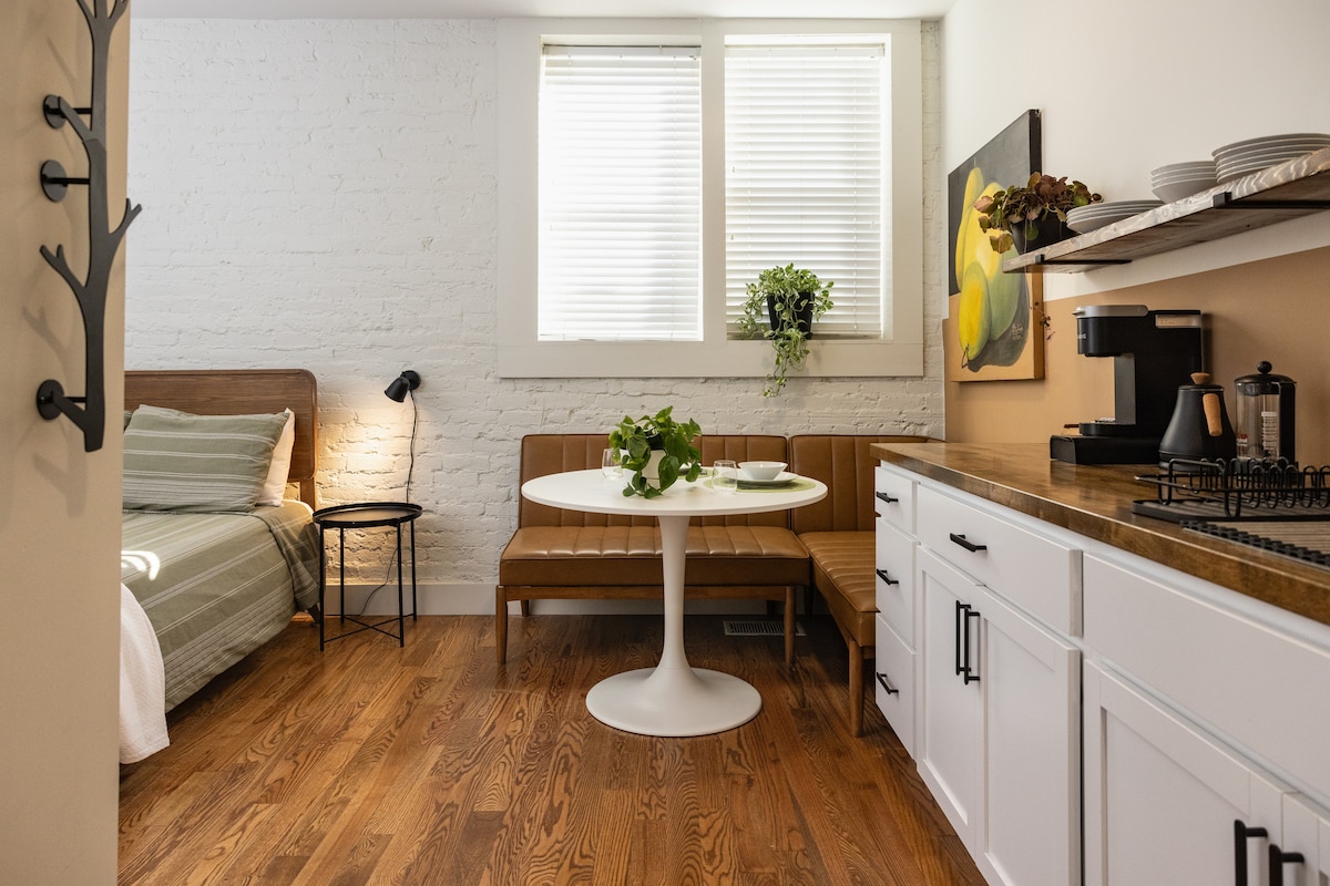 Neu renoviertes Studio im Herzen der Innenstadt von Knoxville, perfekt gelegen, nur wenige Gehminuten von den Top-Attraktionen, lokalen Restaurants, Geschäften und dem UT-Stadion entfernt. Dieses stilvolle Studio bietet bequem Platz für 4 Personen und verfügt über ein gemütliches Bett, ein warmes Ambiente und eine praktische Aufteilung, die ideal für abenteuerlustige Paare, Geschäftsreisende und Familien ist. Wende dich bei Fragen an uns – deine Gastgeber sind reaktionsschnell, freundlich und freuen sich, dich bei deinem Aufenthalt in Knoxville begrüßen zu dürfen.