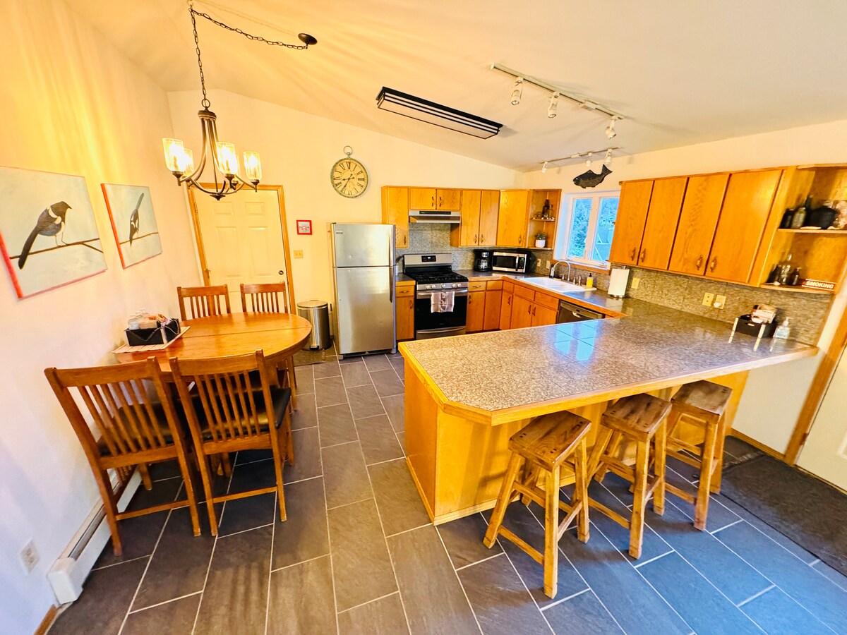 Dieses moderne Haus mit 3 Schlafzimmern und 3 Badezimmern wurde für Komfort und Bequemlichkeit entworfen und ist perfekt für Arbeitsgruppen, Fachleute oder Familien, die Kodiak besuchen. Jedes Schlafzimmer verfügt über ein Queensize-Bett und einen eigenen Stauraum. Genieße eine voll ausgestattete Küche, einen geräumigen Wohnbereich mit Smart-TV, schnelles WLAN, eine Waschküche in der Unterkunft und viele Parkplätze. Nur wenige Minuten von Walmart, Safeway entfernt. Sauberes, gepflegtes Zuhause bietet alles, was man für einen produktiven und erholsamen Aufenthalt braucht.
