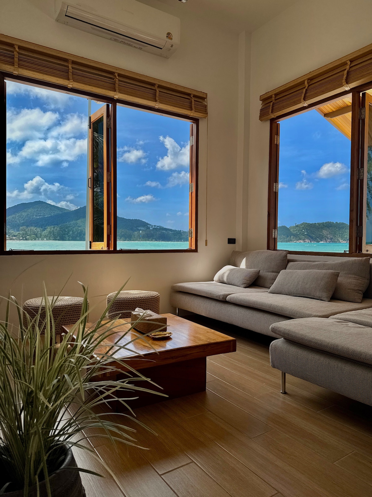 Entfliehe in unsere 65 m² große Villa am Strand mit 2 Betten und 2 Bädern sowie einem minimalistischen Schwarz-Weiß-Design. Genieße natürliches Licht, gemütliche Schlafzimmer und eine ausgestattete Küche. Die große Terrasse ist perfekt zum Entspannen oder Essen, während du den Sonnenuntergang beobachtest, oder entspanne dich am Gemeinschaftspool, der von üppigem Grün umgeben ist und nur 10 Schritten von der Villa entfernt liegt. Mit direktem Zugang zu weichem Sand und nahe gelegenen lokalen Restaurants ist dies dein idealer Kurzurlaub. Genieße kostenfreies WLAN und eine Klimaanlage für einen angenehmen Aufenthalt.
