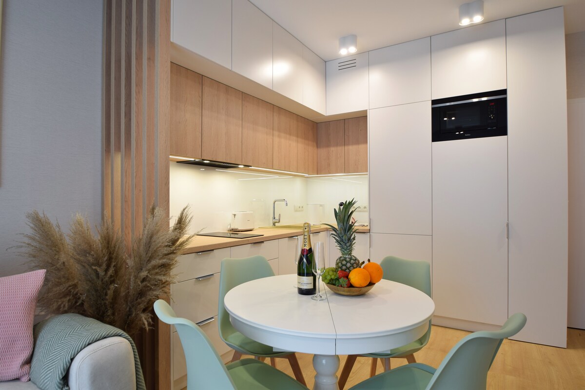Unsere Apartments sind so eingerichtet, dass sie freundlich und komfortabel für Familien mit Kindern, Freundesgruppen oder Paare sind, die eine romantische Zeit an der Ostsee verbringen möchten. Wir haben 2 Wohnungen mit 2 Schlafzimmern und 4 Schlafzimmern nebeneinander. Neubau, geschlossene Bereiche mit Spielplätzen und Fitnessstudios im Freien, grüne ruhige Umgebung, Nähe zum Strand machen den Ort einzigartig und unvergesslich, und unsere Gäste sind gespannt darauf, wiederzukommen :)