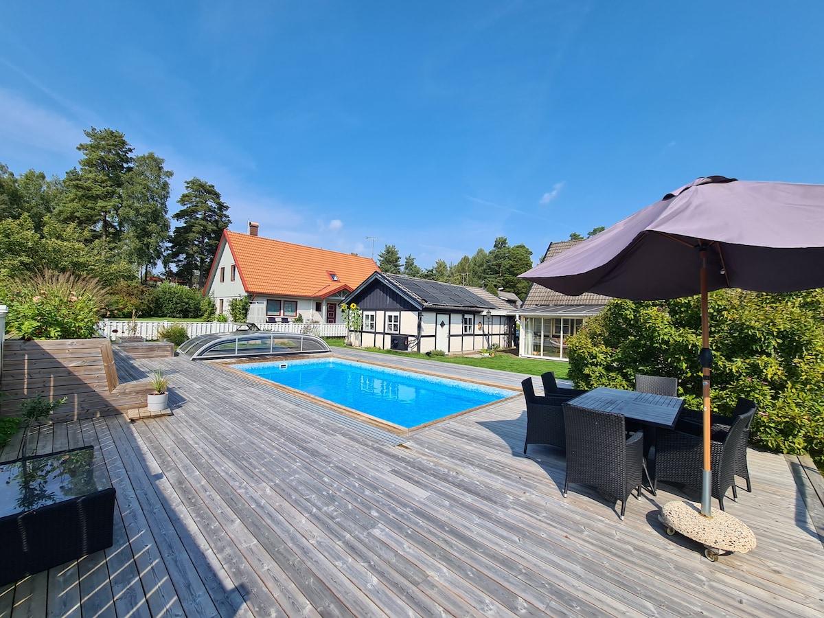 Entspanne dich mit Familie und Freunden in unserer Villa auf dem Land. Mit Zugang zu einem privaten Pool (vom 1. Juni bis 14. September), Whirlpool und Sauna. Das Haus liegt neben Wiesen und Wald. Schöne Spaziergänge im Pfifferlingswald oder im Heidelbeerbusch! Wenn du Glück hast, erscheint der Elch auf dem Weg, auf der Wiese neben dem Haus grasen die Hirsche. Es ist möglich, Bettwäsche und Fahrräder zu mieten. Und kaufe die Abreisereinigung, wenn du nicht selbst reinigst.