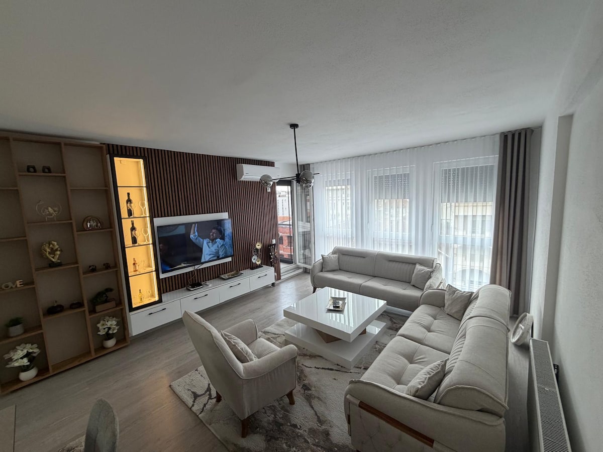 Atemberaubende neue Wohnung (94 Quadratmeter) zur wöchentlichen oder monatlichen Vermietung (mindestens 7 Tage). Das Hotel liegt in der „Ismail Loshi“ Straße in Mitrovica, nur 1 km (15 Gehminuten) vom Stadtzentrum entfernt, in der Nähe der Ibri-Brücke. Mit einem geräumigen Wohnzimmer, zwei Schlafzimmern (insgesamt 3 Betten), einem Badezimmer, einem Abstellraum, einem Balkon und einer Tiefgarage. Ausgestattet mit Annehmlichkeiten wie TV, WLAN, Kühlschrank, Herd, Besteck, Warmwasserbereiter, Kleiderschränken und mehr, die ein komfortables hausähnliches Erlebnis gewährleisten.