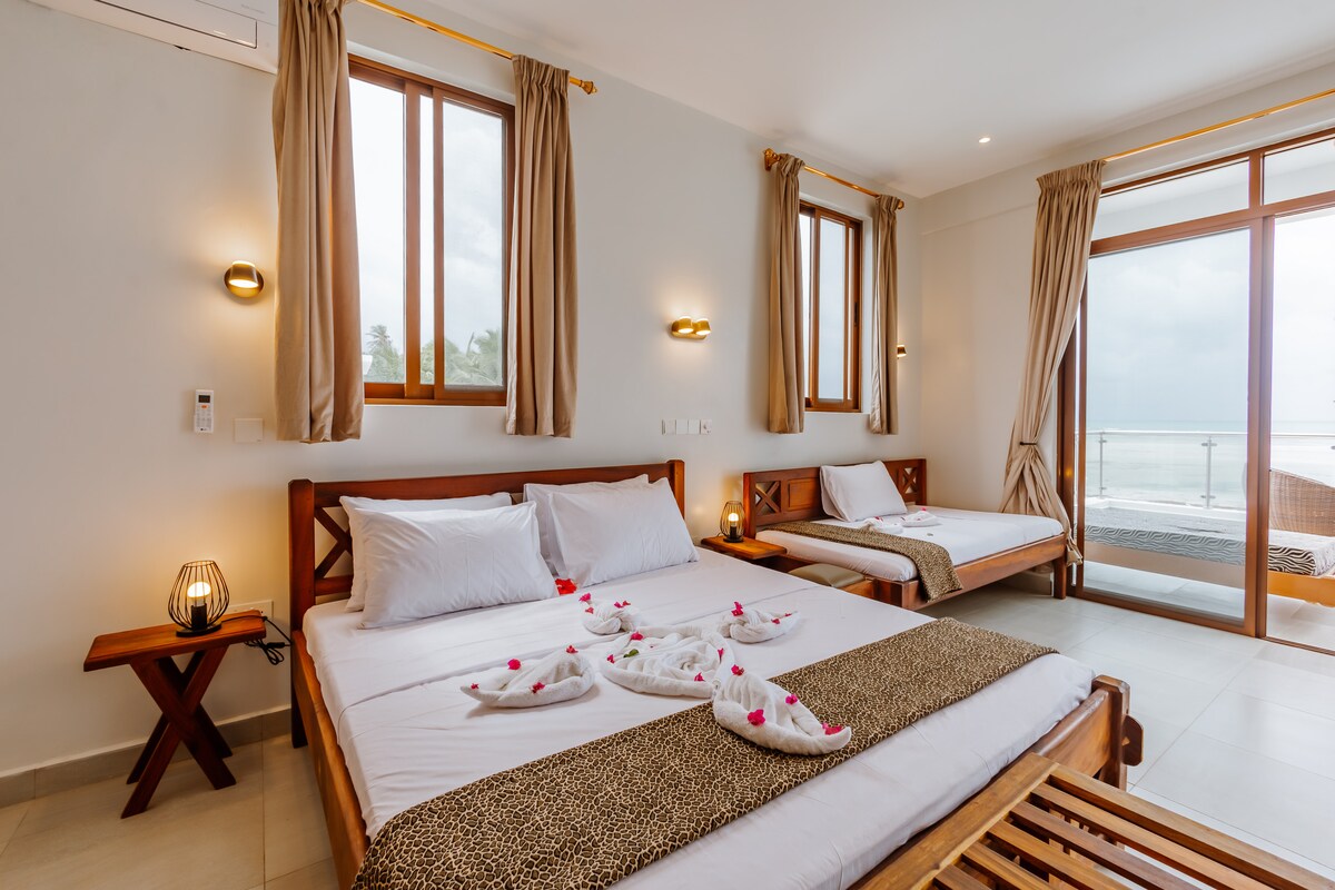 Ein geräumiges Zimmer, eigenes Bad mit eigenem privaten privaten Eingang. Es gibt eine Ventilatorkühlung. Es verfügt über ein Doppelbett, 2 Einzelbetten, einen Moskitonetzschutz und zweimal täglich Zimmerreinigung. Es gibt auch eine abschließbare Box zur Aufbewahrung Ihrer Wertsachen. Bettwäsche und Handtücher werden im Preis inbegriffen und häufig gewechselt. Das Badezimmer verfügt über eine Warmwasserdusche, durch Solaranlage, und bei Stromausfällen gibt es wieder Strom. Es gibt auch einen privaten Sitzbereich auf der Terrasse vor deinem Zimmer und den Kitespeicher.