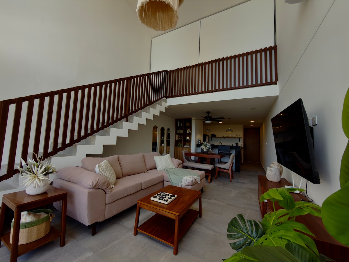 Modernes, helles und durchdacht eingerichtetes zweistöckiges Penthouse in Bona, Temozón Genieße das zweistöckige Design mit einer voll ausgestatteten Küche, einem Esszimmer mit doppelter Höhe und einem Schlafzimmer mit begehbarem Kleiderschrank und Badezimmer. Im Obergeschoss befindet sich ein Wohnzimmer mit einem Schlafsofa, das ideal für zwei Personen ist. Entspanne dich auf der spektakulären privaten Terrasse mit Atelier, einer Außenlounge und Liegestühlen. Erlebe das Erlebnis mit erstklassigen Annehmlichkeiten: Pool, ADIDAS-Paddelplatz, Spaßraum, Grillbereich und 24-Stunden-Sicherheit.