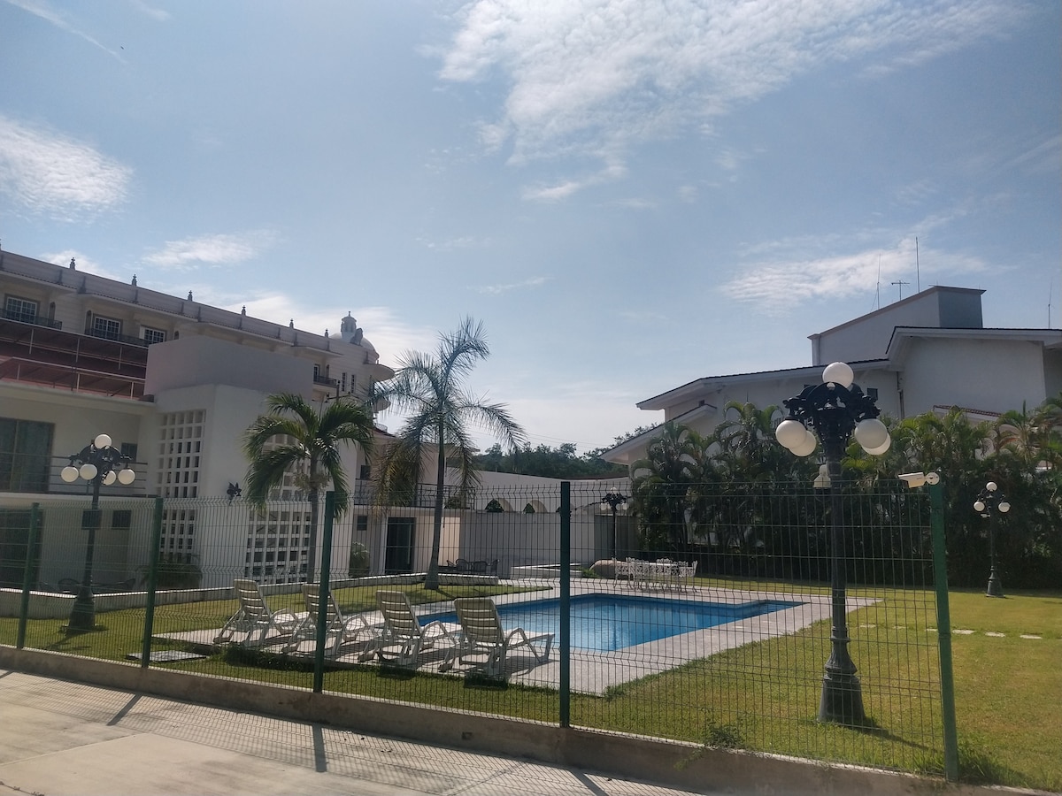 Wir sind eine Oase im Herzen der Hotelzone von Tangolunda. Zu den großen Hotels, Barceló, Dreams, Royal Park, Quinta Real, Camino Real und Palacio. 100 Meter direkt vom Strand entfernt. Unabhängiges Studio im Erdgeschoss des Hotels mit schönem Gartenblick für 2 Personen mit Option und zusätzlichen Kosten für 2 weitere Personen. Kingsize-Bett, Küche, Klimaanlage, Waschmaschine (gegen Aufpreis), Badezimmer, Badezimmer, Smart TV50, Smart TV50, Internet Starlink. Mit 3 Restaurants, Minisuper und Parkplatz