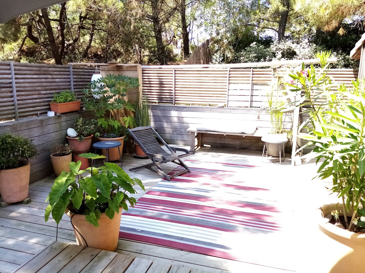 Ein paar Dutzend Meter vom Strand entfernt, auf der Beckenseite und 1 km vom Meer entfernt, kommen Sie und tanken Sie neue Energie in dieser Hütte, die im Grünen mit gepflegter Dekoration ertränkt ist. Perfekt für ein Paar mit einem oder zwei Kindern, es ist von einem großen Garten mit Bäumen umgeben, der mit einer großen Terrasse mit Gartenmöbeln und Plancha, einer ausgestatteten Küche, einem Holzofen und einer Badewanne ausgestattet ist. Alle Elemente sind für einen angenehmen Aufenthalt in der Natur und in ruhiger Lage vereint