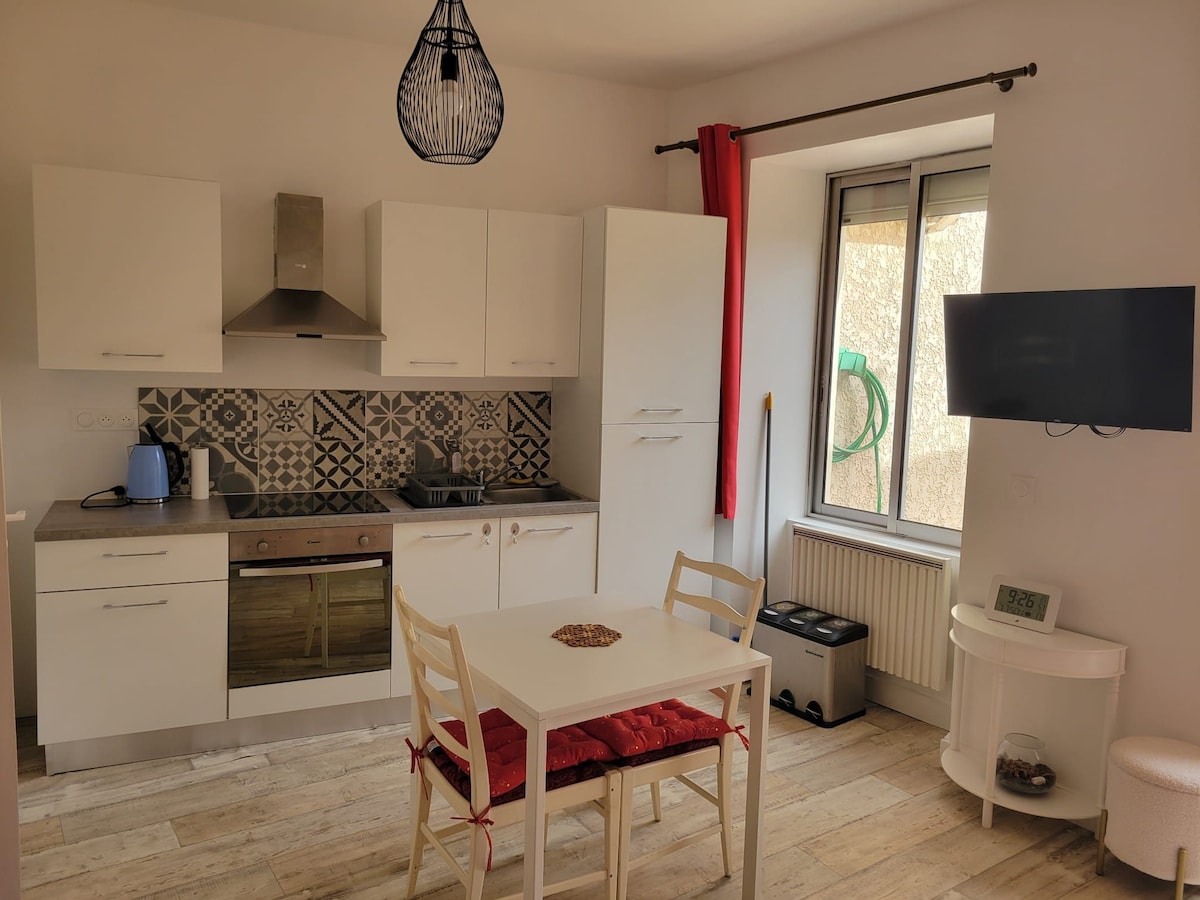 Große Unterkunft mit einem einzigen Raum von 45 Quadratmetern mit Einbauküche (Backofen, Mikrowelle, Herd, Kühlschrank). Eine Sitzecke mit einem Schlafsofa, ein Bett (neue Bettwäsche 160/200), ein Essbereich mit 4 Stühlen, ein Ankleidezimmer... Ein großes Duschbad, Handtuchtrockner... Es ist für bis zu 4 Personen (inkl. Kinder) und ein Baby. Eine große Terrasse mit Tisch und Stühlen mit Blick auf einen Garten ohne Gegenüber. (Außer Eigentümer). Leider akzeptieren wir keine Haustiere