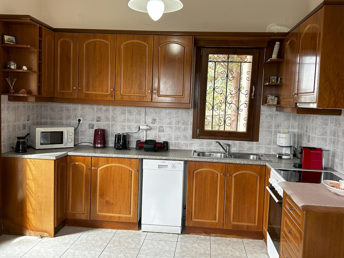Ferienhaus mit moderner Architektur, auf einem Hügel gelegen, mit Blick auf die Argolische Bucht und die Insel Spetses. Ideal für einen Urlaub abseits des hektischen Treibens. Touristenattraktionen befinden sich in den nahegelegenen Städten Tyros und Leonidio. Viele schöne Strände in der Nähe.