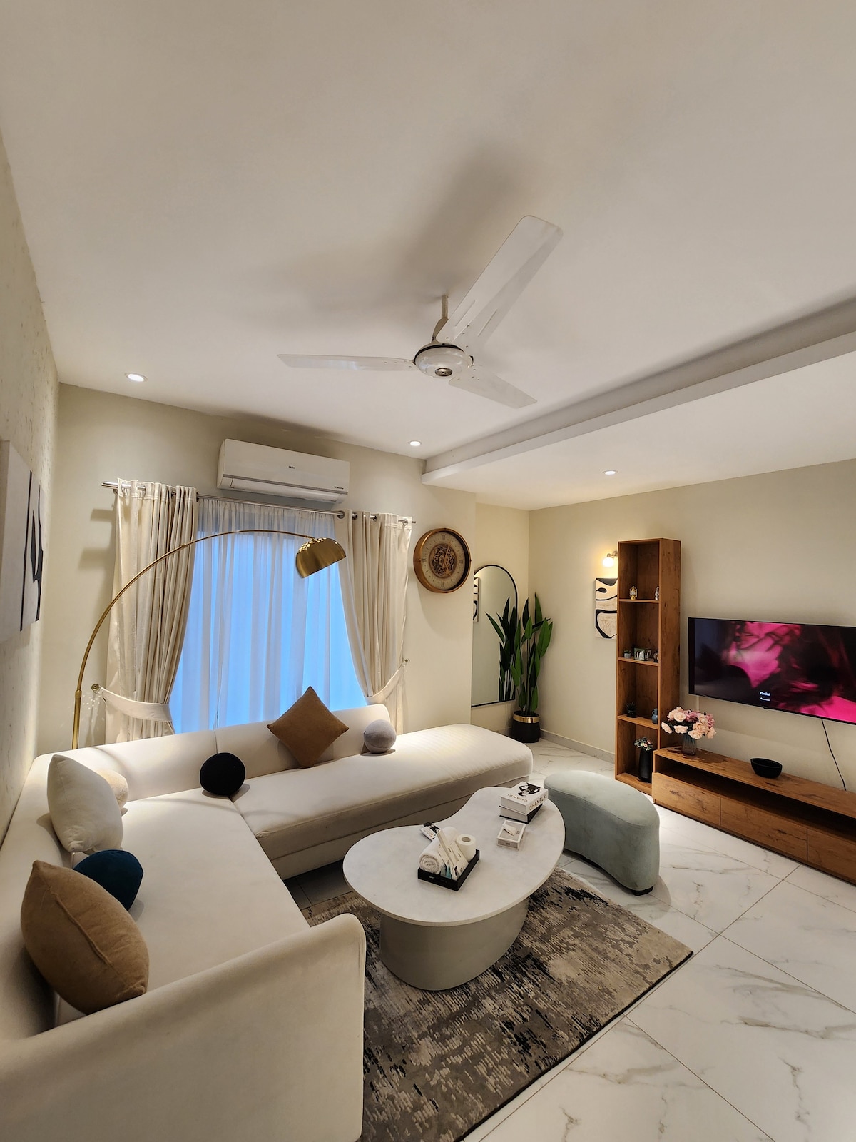 Unsere 1-Zimmer-Eigentumswohnung in DHA Phase 5 ist der Ort, an dem urbaner Chic auf himmlische Coolness trifft. Zum Beispiel: eine leuchtende Mondwand für nächtliche Selfies und ein kühnes Kunstwerk mit Dollarzeichen, das „Hauptfigur-Energie“ ausstrahlt. Wache auf und genieße den Blick auf den Park von deiner privaten Balkonschaukel aus, schau dir deine Lieblingssendungen auf dem 50-Zoll-4K-Smart-TV an oder koche etwas Ästhetisches in der voll ausgestatteten Designerküche. Die Innenräume? Abstrakt, stilvoll und für den Feed gemacht. Außerdem bist du direkt neben den angesagtesten Restaurants von Lahore.