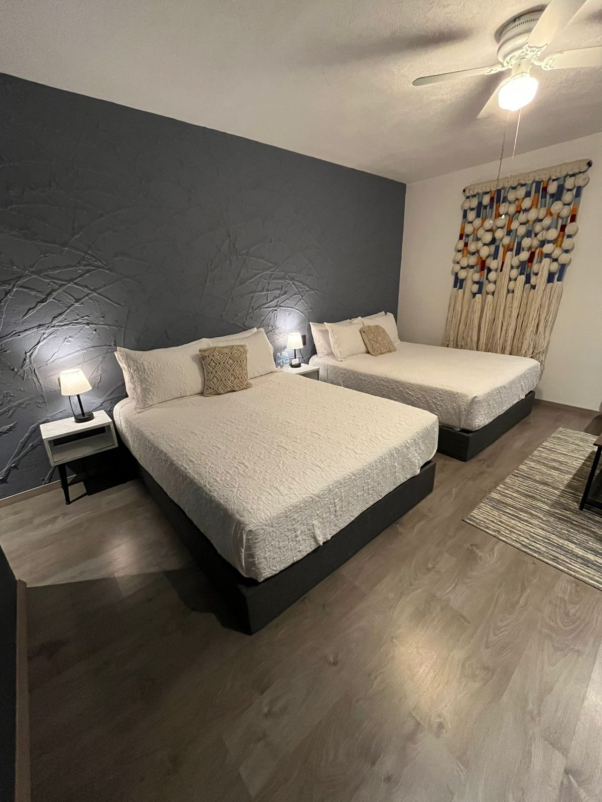 Ein sicherer und ruhiger Ort, weiche und bequeme Betten, verfügt über 24-Stunden-Warmwasser, Deckenventilatoren, Kabel-TV, WLAN, Beleuchtung, die nach deinen Wünschen anpassbar ist, 1 Kingsize-Betten oder wir haben auch Zimmer mit 3 Doppelbetten
