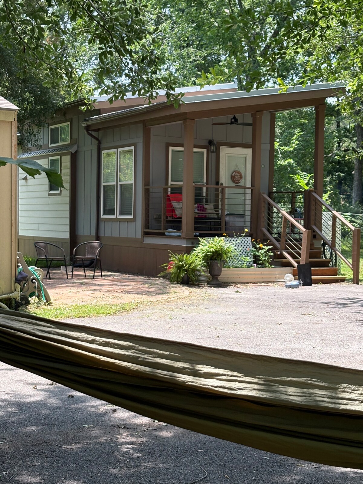 Entfliehe in dieses ruhige, gemütliche Tiny Home mit 1 Schlafzimmer in Conroe. Volles Bett im Schlafzimmer, 2 Einzelbetten im Loft (ein lustiger Ort für die Kinder) und ein Schlafsofa. Das Refuge ist bequem für eine Einzelperson, ein Paar oder eine Familie. Genieße High-Speed-WLAN, Föhn, Dampfglätter, große Geräte, Terrasse mit Möbeln, Grill, Hängematte und die Privatsphäre und Schönheit eines Grundstücks mit alten Eichen. Unser Badezimmer verfügt über eine große Dusche mit Pflegeprodukten. Beobachte und füttere Freilandhühner über den Zaun von der Terrasse.