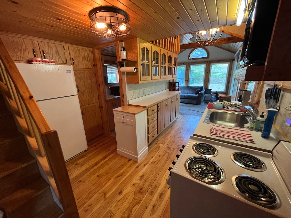 Studio am See, in dem Retro- und rustikaler Charme auf modernen Komfort treffen. Das Studio bietet alles, was du für einen erholsamen und angenehmen Aufenthalt benötigst, einschließlich eines Queensize-Bettes, eines Wohnbereichs mit einem Roku-Fernseher, einer voll ausgestatteten Küche und eines Badezimmers mit einer ebenerdigen Dusche. Die Veranda am See bietet den perfekten Ort, um deinen Morgenkaffee zu genießen oder dich mit einem guten Buch zu entspannen. Zwei Sitzkajaks sind inbegriffen. Fahrräder sind verfügbar und Wander- und Fahrradrouten befinden sich gleich auf der anderen Straßenseite.