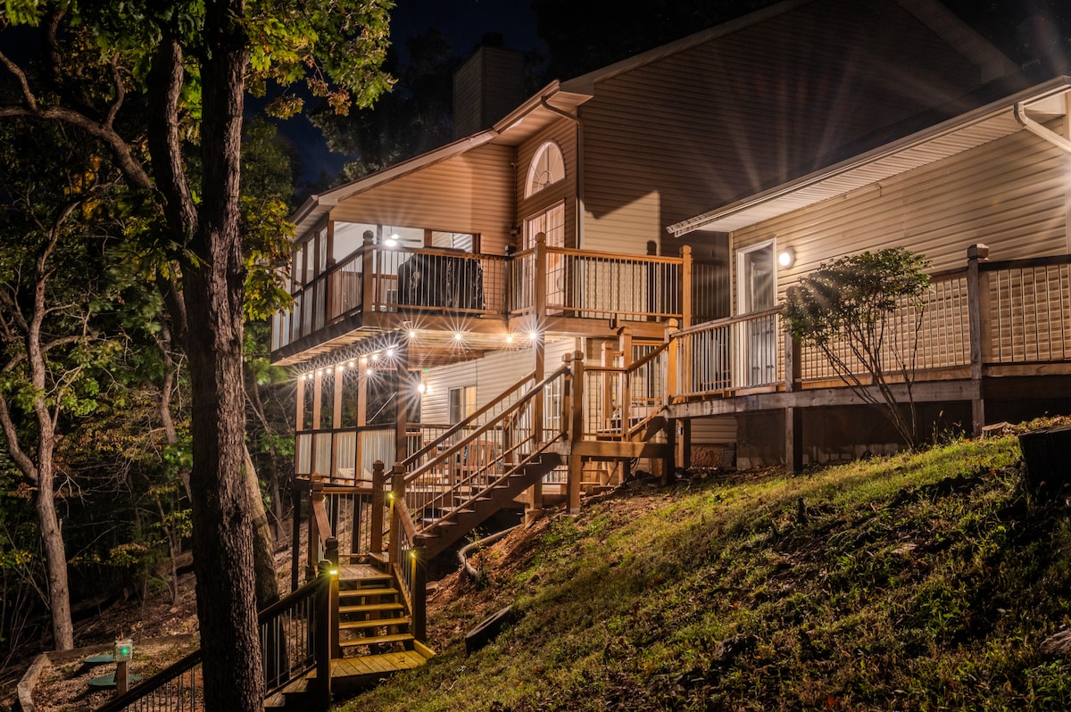 Oben in den Wolken mit Aussicht von jedem Zimmer und vom Balkon. Spielzimmer mit Billardtisch, Spielautomaten, Shuffleboard und Bar. Die voll ausgestattete Küche und der Gasgrill eignen sich perfekt für Gourmet-Mahlzeiten oder Snacks am späten Abend. Verbringe eine Nacht an einer einzigartigen Feuerstelle und genieße die Sonnenuntergänge von 3 Balkonen aus. Dieser einzigartige Rückzugsort liegt nur 13 Minuten von den Restaurants, dem Nachtleben, den Stränden und den Familienattraktionen von Bagnell Dam entfernt und bietet Spaß im Spielzimmer, eine atemberaubende Aussicht von jedem Zimmer aus und luxuriösen Komfort.