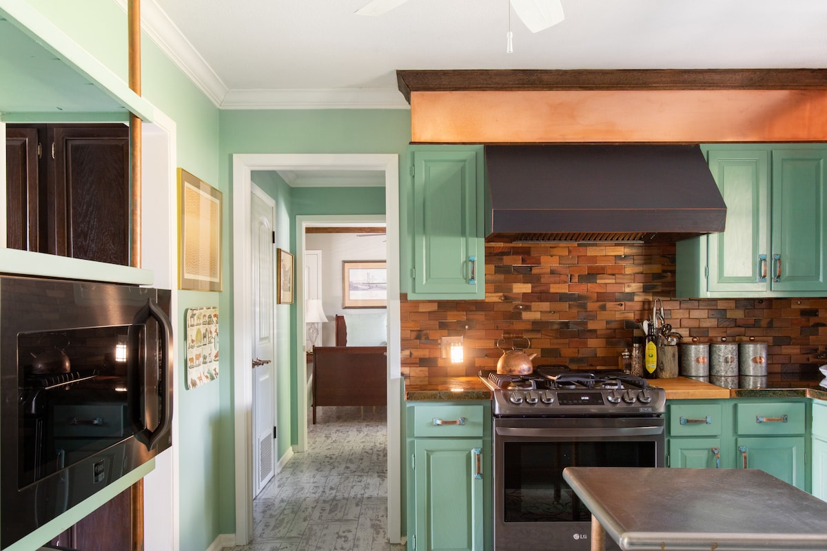 ✨ Entfliehe in diesen stilvollen Rückzugsort am Lake Travis mit Cowboy-Pool, eingezäuntem Garten und Panoramablick. Das Haus ist perfekt für bis zu 4 Gäste und verfügt über ein Schlafzimmer mit Kingsize- und Queensize-Bett, 2,5 Badezimmer und eine voll ausgestattete Küche mit Viking-Geräten und lokalen Leckereien sowie eine italienische Espressomaschine. Entspanne dich in der Hängematte, grille auf der Terrasse oder spaziere zum See zum Schwimmen und für Sonnenuntergänge. In der Nähe von Hippie Hollow, The Oasis und Austin Sehenswürdigkeiten - Haustiere willkommen!