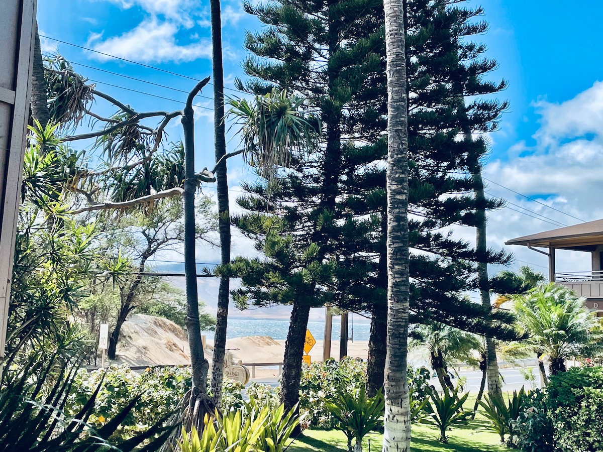 In lokalem Besitz und betrieben 1BD/2BA Eigentumswohnung mit der besten direkten Strandlage, Panoramablick auf das Meer, Sonnenuntergänge und saisonale Walbeobachtung. Der Eigentümer hat keine Kosten gescheut, um diese Einheit zu renovieren, was sie zu einer der schönsten Einheiten in ganz Mahana macht. Wache mit der kühlen tropischen Brise und den Geräuschen der Küste auf, die nur 50 Fuß entfernt ist. Vom Boden bis zur Decke reichende Fenster im Wohnbereich und Schlafzimmer bringen die atemberaubende Aussicht und die warme Sonne von Maui ins Innere, während die zentrale Klimaanlage dich im Inneren kühl hält.