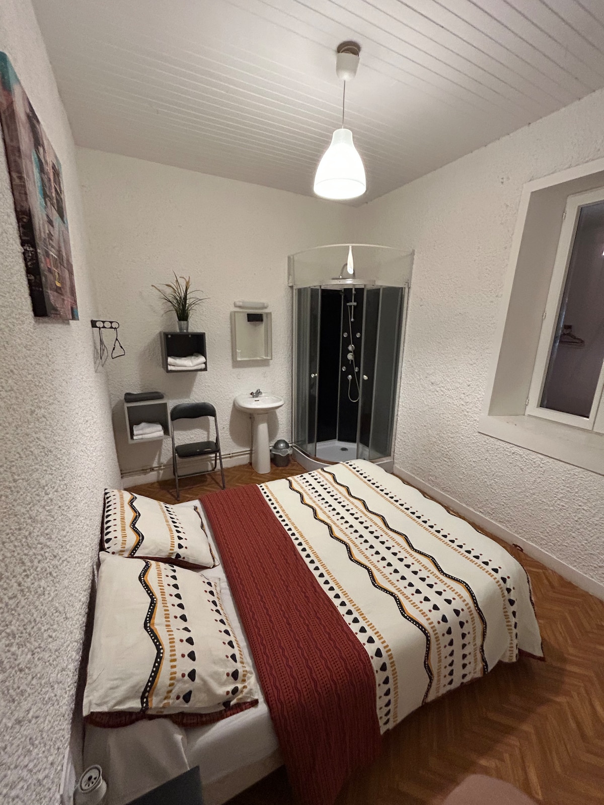 Zimmer in einem Hotel im Dorfzentrum. Doppelbett 140 x 190 cm, Badezimmer und eigenes WC. Mikrowelle und Kaffeemaschine auf dem Treppenabsatz. Gefriert rauch Einfache Parkmöglichkeiten auch für große Fahrzeuge.