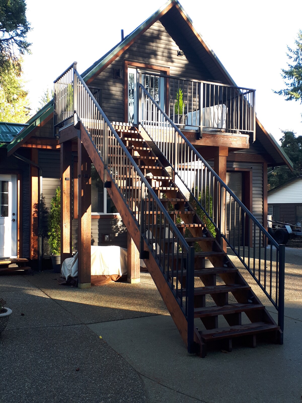 Bezaubernde, voll möblierte Suite mit 2 Schlafzimmern, Parkplatz und eigenem Eingang. Wir haben keine zentrale Klimaanlage, aber da die Suite auf einer Zementplatte sitzt, bleibt die Temperatur den ganzen Sommer über schön kühl! Umgeben von Natur und nur wenige Schritte vom Salish-Meer entfernt! Bring deine Kajaks mit und entfliehe deinem geschäftigen Leben für einen wohlverdienten Rückzugsort. Gelegen im Dorf Lantzville, nördlich von Nanaimo.