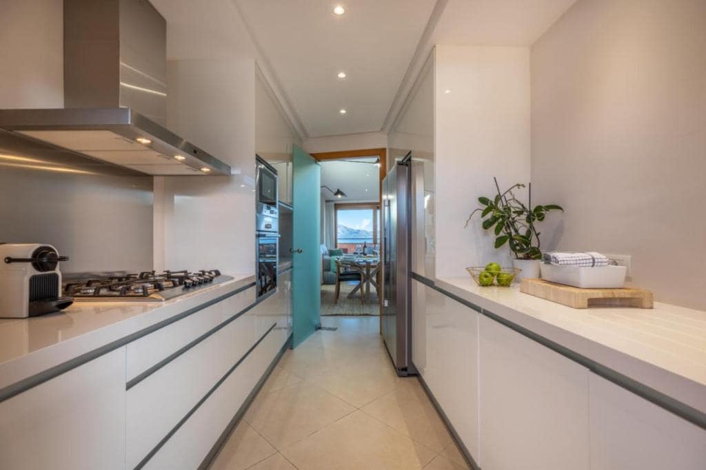 Es gibt eine offen gestaltete Küche mit weißen Apparaten und Geräten wie einem Kühlschrank mit Gefrierfach, einer Mikrowelle, einem Elektroofen, einem Geschirrspüler, einem Elektroherd mit zwei Kochplatten und Küchenutensilien zur Selbstverpflegung. Es gibt einen gemütlichen Wohnbereich mit einem Sofa und einem Tisch mit Stühlen, Glasschiebetüren, die sich zum schönen Balkon über der Strandstraße öffnen und einen schönen Blick direkt auf die Bucht und den Strand bieten. Zweibettzimmer mit Einbauschrank, ein Badezimmer, WC, Waschbecken und Bidet.