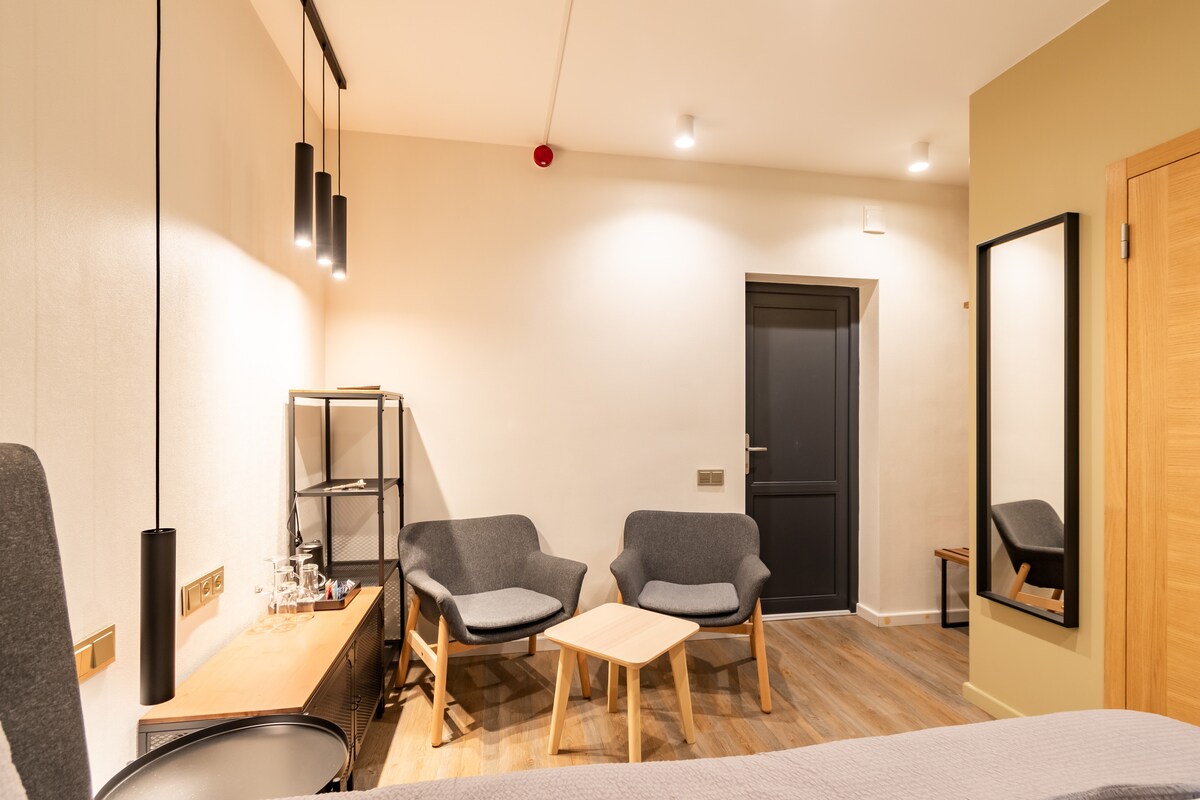Zimmer 4 mit zwei Betten (bis zu 2 Personen) Das Zimmer ist mit zwei Betten, TV, WLAN, einem Tisch, zwei Liegestühlen, einer Kommode, einem Liegestuhl, einem Wasserkocher mit einer Vielzahl von Getränken, Gläsern und Tassen ausgestattet. Toilette : Dusche, Topf, Waschbecken, Fön, Spiegel, notwendige Hygieneartikel für einen angenehmen Aufenthalt, Handtücher. Das Zimmer befindet sich im 1. Stock des Gebäudes Das Frühstück ist verfügbar und leckere Mahlzeiten können über die WOLT-Plattform bestellt werden. Kostenlose Parkplätze auf dem Gelände des Erholungskomplexes