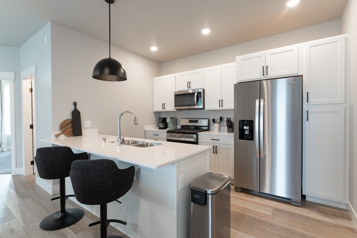 Willkommen in unserem charmanten, zentral gelegenen Tiny Home, nur wenige Minuten von der Innenstadt von Billings, beiden Krankenhäusern und dem Flughafen entfernt. Dieser moderne Raum verfügt über hohe Decken, große Fenster, die das Haus mit natürlichem Licht füllen, und ein Queensize-Bett, das eine erholsame Nachtruhe verspricht. Genieße den Komfort eines Kühlschranks, Backofens/Herd und einer neuen großen Waschmaschine und eines Trockners. Mit atemberaubenden Fliesenarbeiten und beheizten Badezimmerböden haben wir einen Raum geschaffen, in dem du dich wirklich entspannen und wie zu Hause fühlen kannst.