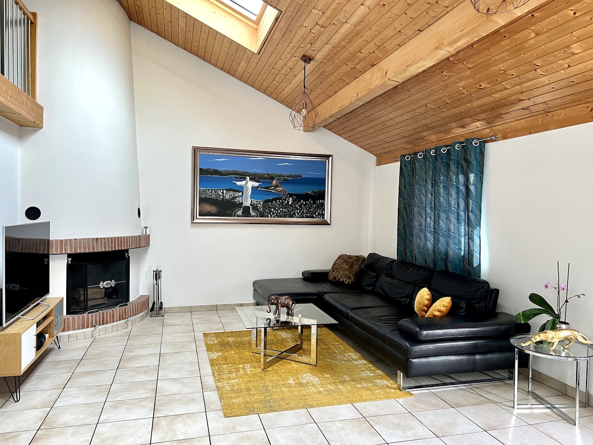 Entfliehe diesem warmen und geräumigen Holzhaus, in dem Natur, Komfort und Ruhe zusammenkommen - nur wenige Minuten von Lausanne entfernt. Egal, ob du eine Familie, ein mobiler Mitarbeiter oder Reisender bist, der Ruhe sucht, während du in der Nähe des Geschehens bleibst, dieser charmante Rückzugsort ist der perfekte Ort, um dich zu entspannen. Warum es dir gefallen wird: - Gemütlicher zentraler Kamin; - 5 Schlafzimmer - Spiele & Tischtennisplatte für lustige Momente - Gesundheitsbau aus Holz für bessere Luftqualität - Privatgarten, um Grillabende und Mahlzeiten im Freien zu genießen.