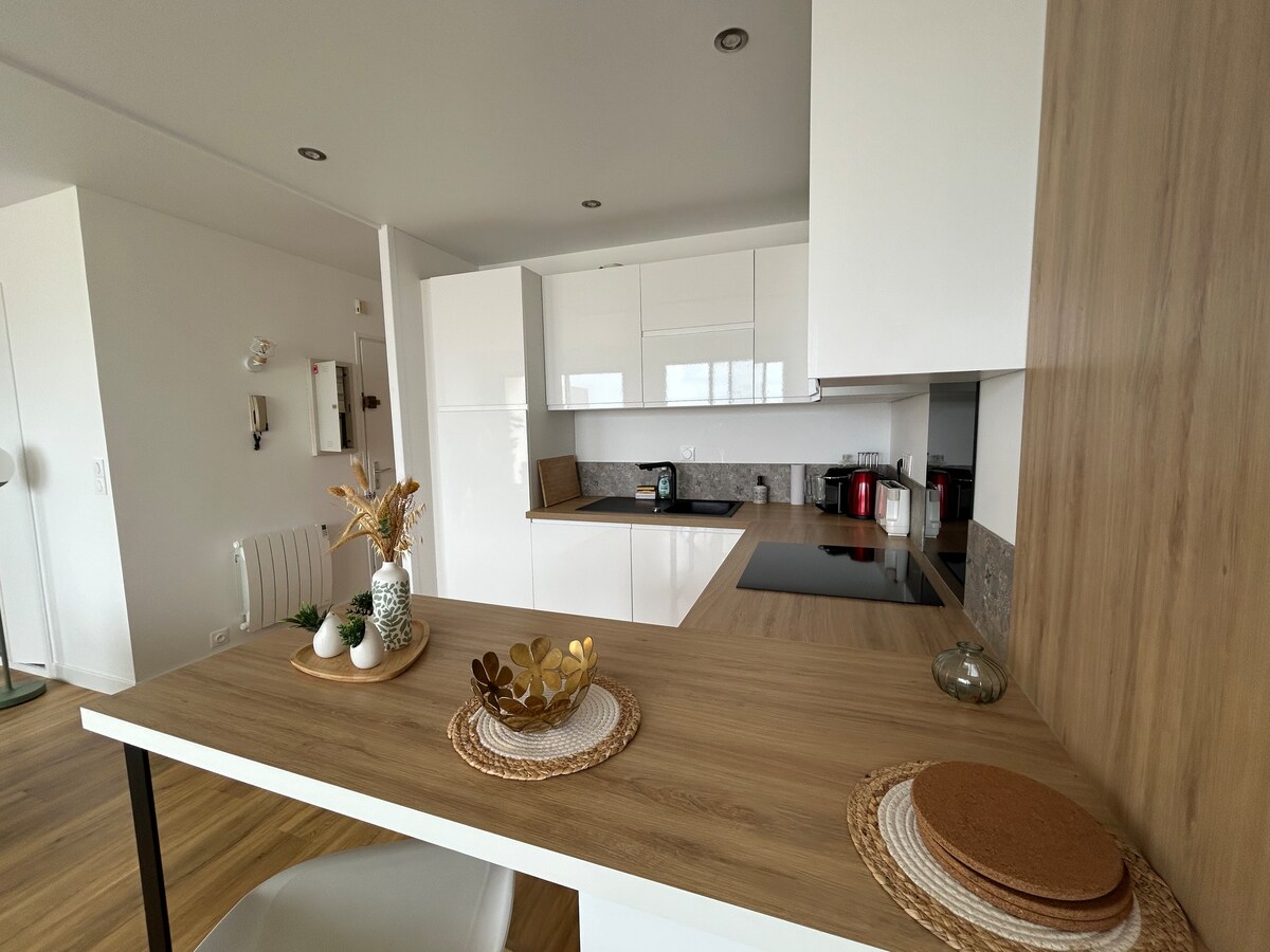 Ein spektakulärer Meerblick – außergewöhnliche Wohnung Diese erhabene 55 m² große Wohnung am Meer befindet sich in der obersten Etage und bietet einen 180°-Panoramablick auf die Bucht von ihrer großen L-förmigen Terrasse. 🛋️ Heller Raum, Design-Dekor, voll ausgestattete Küche, ruhiges Schlafzimmer mit elektrischem Queensize-Bett, große ebenerdige Dusche, separates WC. 🚶♂️ 15 Minuten vom Bahnhof Pornichet entfernt. Überdachter Parkplatz, Bettwäsche und Handtücher inklusive. Ein wirklich schicker und ruhiger Rückzugsort für einen unvergesslichen Aufenthalt am Meer.