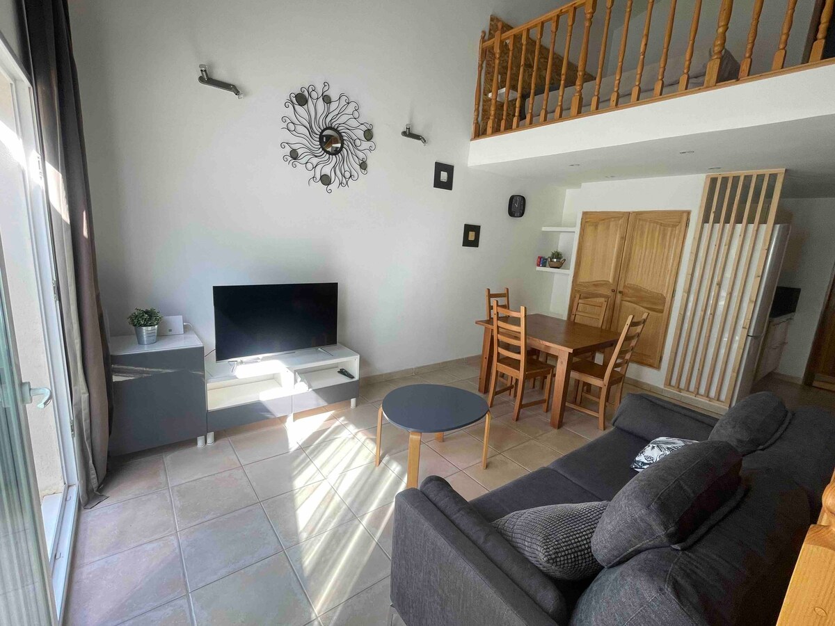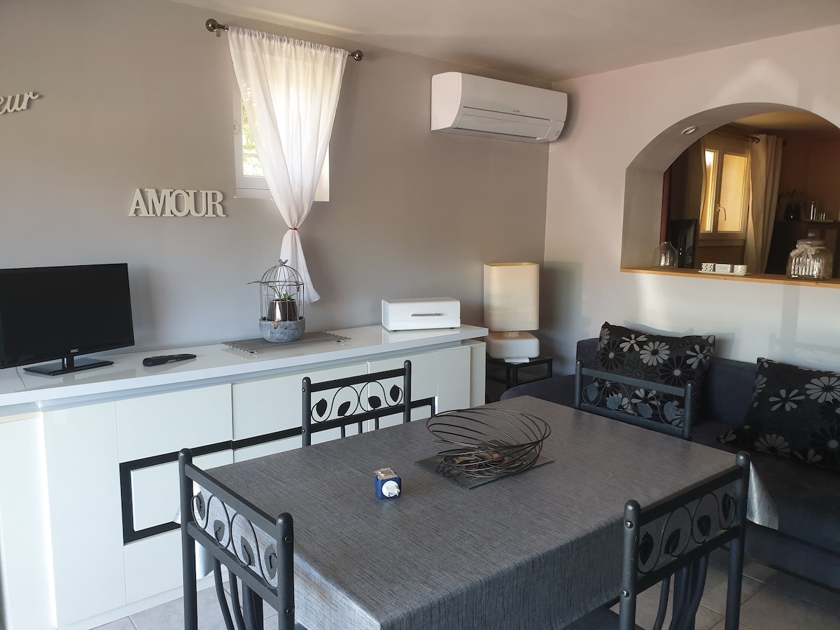 Die 50 m2 große Wohnung ist klimatisiert und mit einem TV und einer WLAN-Verbindung ausgestattet. Sie finden den Komfort einer ausgestatteten Küche, eines Wohnzimmers und eines Essbereichs. Das Badezimmer ist mit einem Haartrockner ausgestattet und Handtücher werden zur Verfügung gestellt. Im Obergeschoss befinden sich 2 Schlafzimmer mit 2 Betten 140/200 (4 Kissen 60 cm x 60 cm und 2 Bettdecken 240/220 cm). Bettwäsche wird gestellt. Draußen gibt es Gartenmöbel und einen kostenlosen und sicheren Parkplatz mit automatischem Tor.