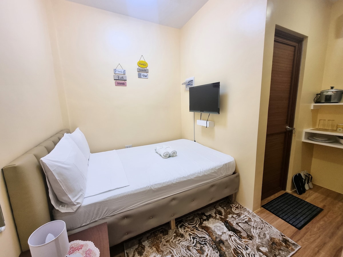 Ein voll möbliertes Apartment mit 1 Schlafzimmer und klimatisiertem Schlafzimmer, ergänzt mit Küche und Waren zum Kochen, Backofen, Wasserkocher, Bügeleisen und Brett, einem großen Flachbild-Kabelfernseher und Netflix, Warm- und Kaltdusche,kostenlosem WLAN. Das Zimmer befindet sich im ersten Stock einer 3-stöckigen Wohnung,gut für Senioren. Es ist 5 Minuten von der Innenstadt/großen Einkaufszentren entfernt. Eine Dachterrasse mit majestätischem Blick auf Mayon steht auch zum Fotografieren zur Verfügung. Gebühr für frühzeitigen Check-in (350 P) beim Check-in vor 10:00 Uhr.