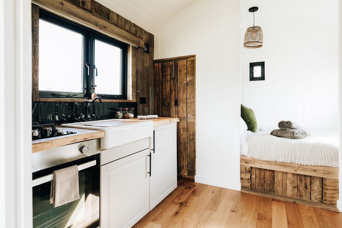 Unsere rustikal-luxuriöse Öko-Schäferhütte ist von Natur umgeben und wird von Vogelgesang beschwichtigt, wo sich modische Typen entspannen. Es mag eine Hütte sein, aber tritt durch die Fenstertüren und der schiere Stil wird dich umhauen: eine Kupferbadewanne mit Rollverschluss … es ist alles ganz besonders. Das Ultimative, was du hier tun kannst, ist, die Doppeltüren zu öffnen, eine Flasche Fizz zu öffnen und in die Badewanne zu steigen oder den Whirlpool für ein Bad im Freien und Sternenbeobachtung rund um die Feuerstelle anzuzünden.
