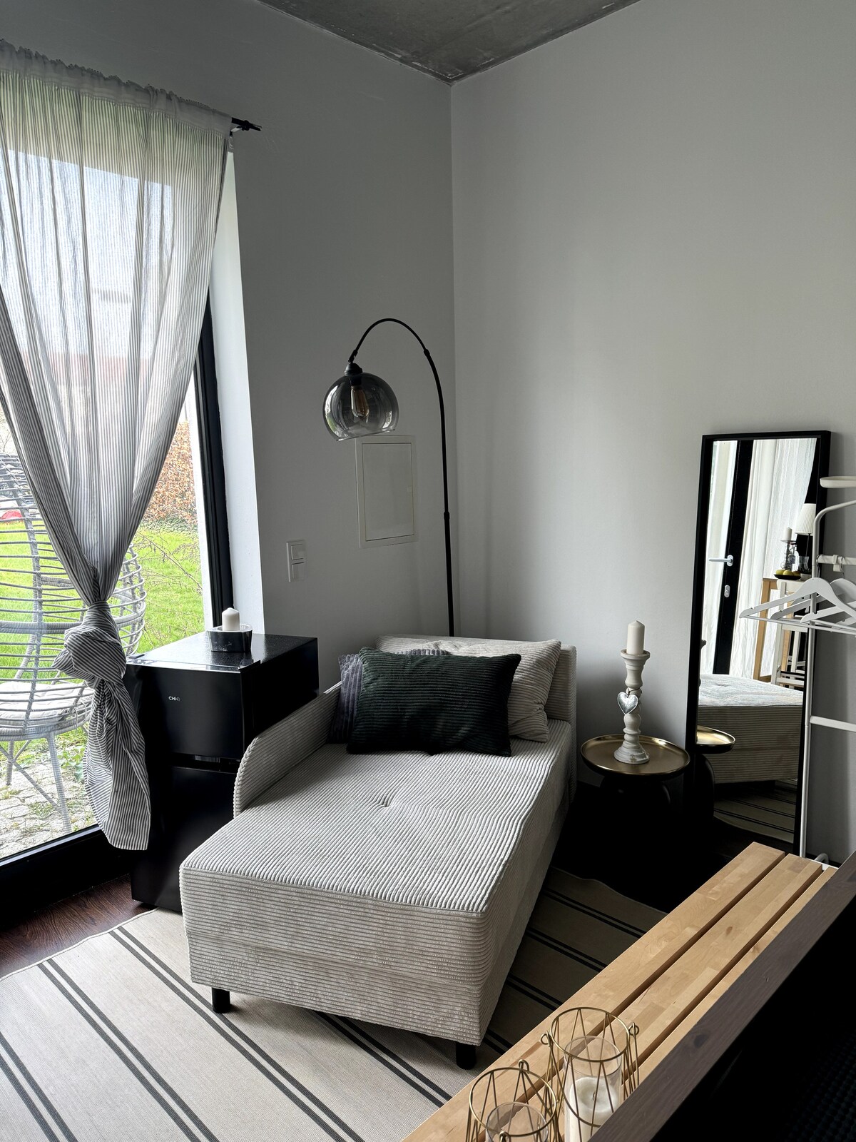 Moderne Oase: Ruhiges & elegantes 40qm Apartment im Townhouse mit eigenem Garten und großzügiger Terrasse für Ihren Berlin-Aufenthalt. Ein 4 m breites Schiebefenster schafft eine ruhige, offene Atmosphäre. Die Fußbodenheizung sorgt für einen angenehmen Komfort. Gelegen in einer ruhigen Wohngegend nahe Ostkreuz, mit guten Anbindungen an die Restaurants, Bars und die kreative Szene in Friedrichshain sowie Alexanderplatz und den BER-Flughafen.