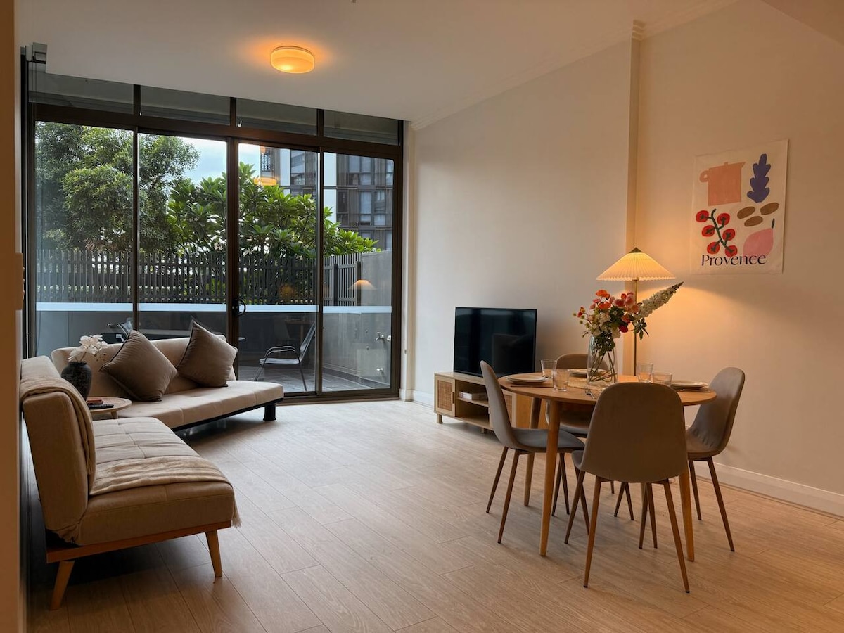 Diese brandneue, stilvolle Wohnung bietet einen Blick auf die Sydney Harbour Bridge. Sie verfügt über komfortable und geräumige Möbel und Queensize-Betten in jedem Zimmer für ein heimeliges Erlebnis. Der kostenlose Fitnessraum im Erdgeschoss hilft dir, auf Reisen fit zu bleiben. Die erstklassige Lage bietet ausgezeichnete Restaurants, Einkaufsmöglichkeiten (DFO) und medizinische Einrichtungen in Gehweite von 2–3 Minuten. Sie liegt 7 Gehminuten vom Bahnhof entfernt, in der Nähe des Olympiastadions und des Aquatic Centre und 18 Fahrminuten vom Flughafen Sydney entfernt.