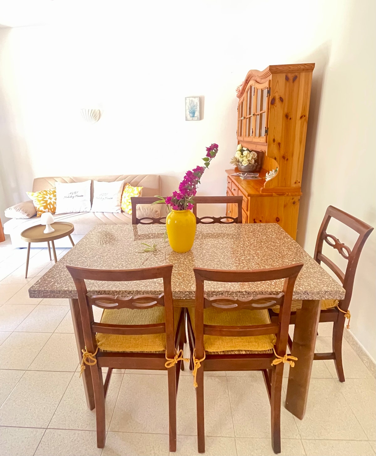 A large living area with living room, TV, Wi-Fi, dining room, kitchenette, laundry room. The small terrace on the floor, which is equipped, provides additional outdoor living space. Restored interior doors. The sleeping area consists of a master bathroom and three air-conditioned bedrooms: two single rooms, one of which has an en suite bathroom, and a double room. The upper terrace is equipped with an outdoor shower, 4 sun loungers, 2 armchairs and a bench, for relaxing breaks and open views.