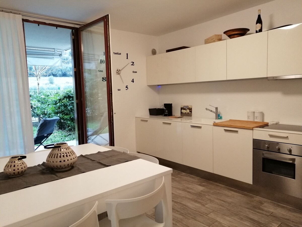 Moderne Wohnung von 60 qm Garten privat von 40 qm Ruhig, abseits vom Verkehr Große private Garage und kostenlose Gemeinschaftsparkplätze Wohnbereich mit Küche, großem Tisch und Sofa Schlafbereich 2 Zimmer, 2 Betten (180*200, 160*200), Klimaanlage Zugang zu den Pools und Saunen (gegen Gebühr) des Villaggio Garda Thermae, zu dem die Wohnung gehört 600 m vom See entfernt, über einen Fußweg erreichbar. Pizzerien und Restaurants in der Nähe Lidl-Supermarkt in 400 m Entfernung CIN: IT022006C2AYQETLGH