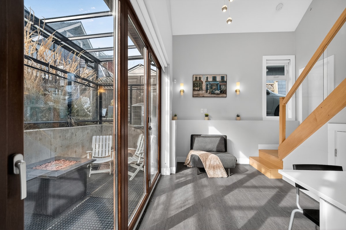 Moderner Komfort und gemütlicher Charme erwarten dich in diesem Loft-Gästehaus. Mit einem einladenden Gaskamin im Hüttenstil und einem Kingsize-Bett ist es der ideale Ort zum Entspannen nach einem Tag voller Erkundungen! Dieses unabhängige Haus verfügt über eine voll ausgestattete Küche, eine private Terrasse und ein modernes Badezimmer mit Badewanne. Direkt am pulsierenden Commercial Drive gelegen, bist du nur wenige Schritte von Vancouvers besten Restaurants, Bars und Boutiquen entfernt. Und der Skytrain liegt nur 7 Gehminuten entfernt. Wo moderner Stil auf gemütliche Wärme trifft, freuen wir uns darauf, dich bei uns zu begrüßen!
