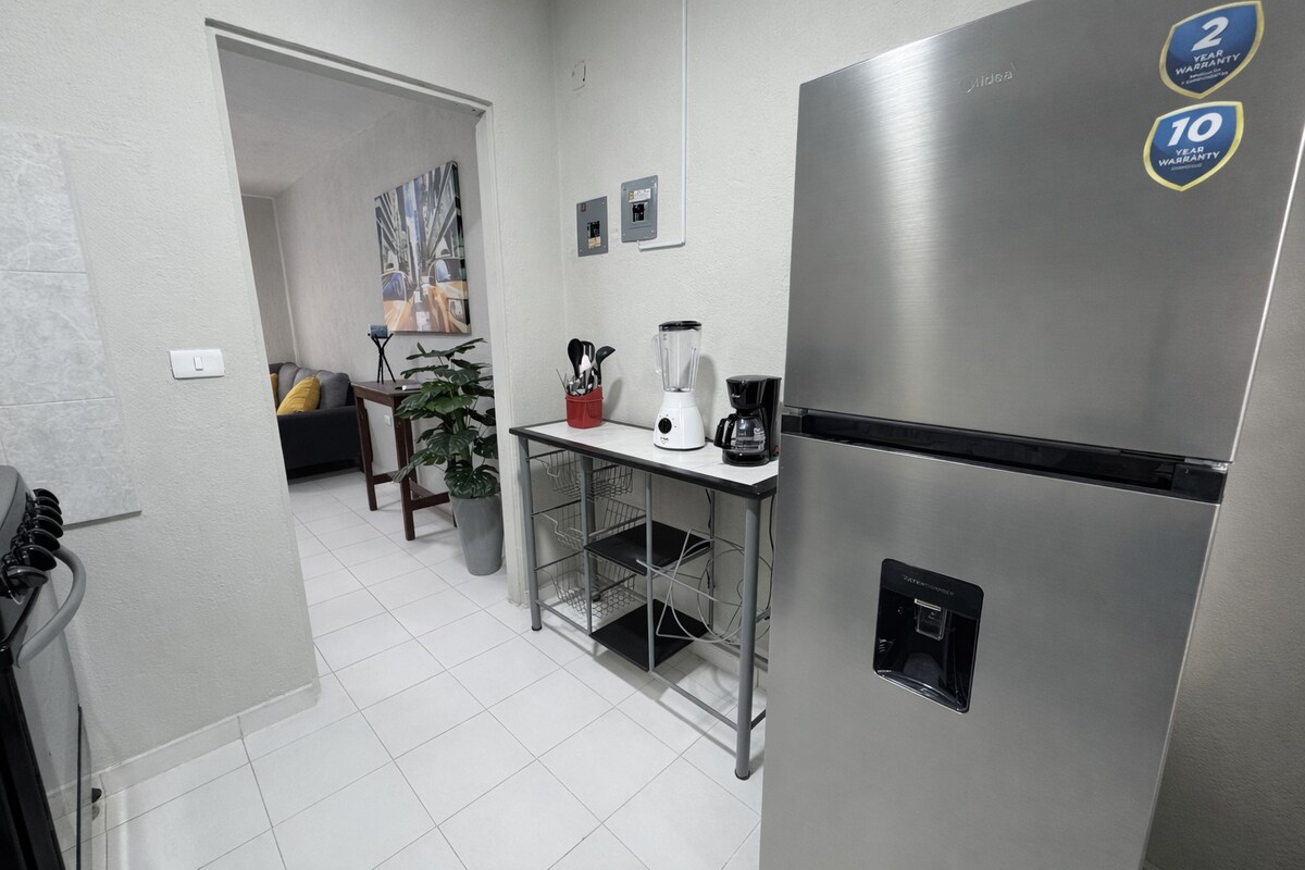 Descansa comodamente en nuestra cama matrimonial con un doble colchón memory foam que se adaptará perfectamente a tu cuerpo. Dormirás fresco pues contamos con A/A minisplit inverter mientras disfrutas de tu programa favorito en nuestra Smart TV con servicios de Netflix y Prime. Toma de una relajante ducha con agua caliente en cualquier momento del día y si tienes hambre no gastes de más, nuestra cocineta equipada tiene todo lo necesario para que puedas preparar tus comidas favoritas.