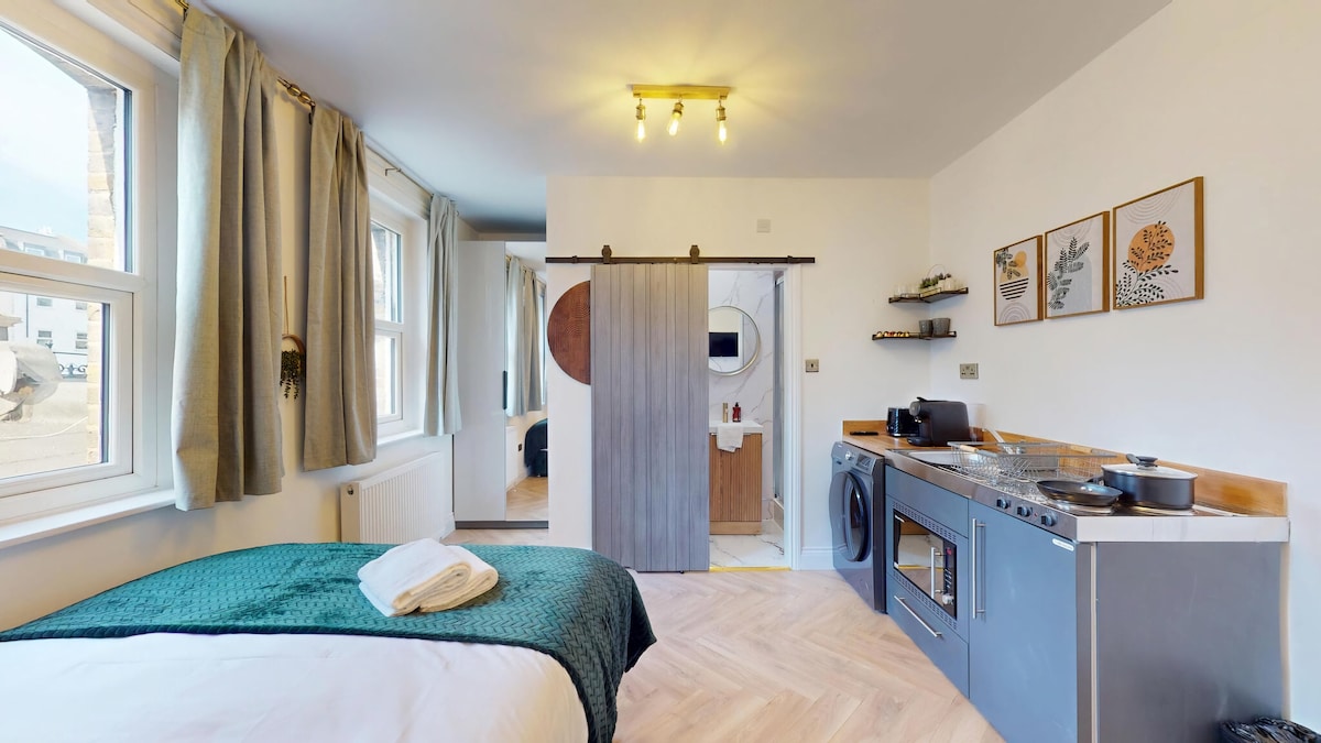 Unsere fantastischen One Bed Apartments im Herzen von Fitzrovia, 4 Minuten vom Oxford Circus entfernt - sind neu auf höchstem Niveau gebaut. Genieße Klimaanlage im Sommer und Fußbodenheizung im Winter, akustische doppelt verglaste Flügel-Fenster, superschnelles Glasfaser-WLAN und Smart-4K-Fernseher. Das Apartment verfügt über eine voll ausgestattete Küche mit modernster Ausstattung und ungiftigem Kochgeschirr. Wir sind Londons erste nachhaltig betriebene Apartments – also komm und lebe gesund und bleib neutral!