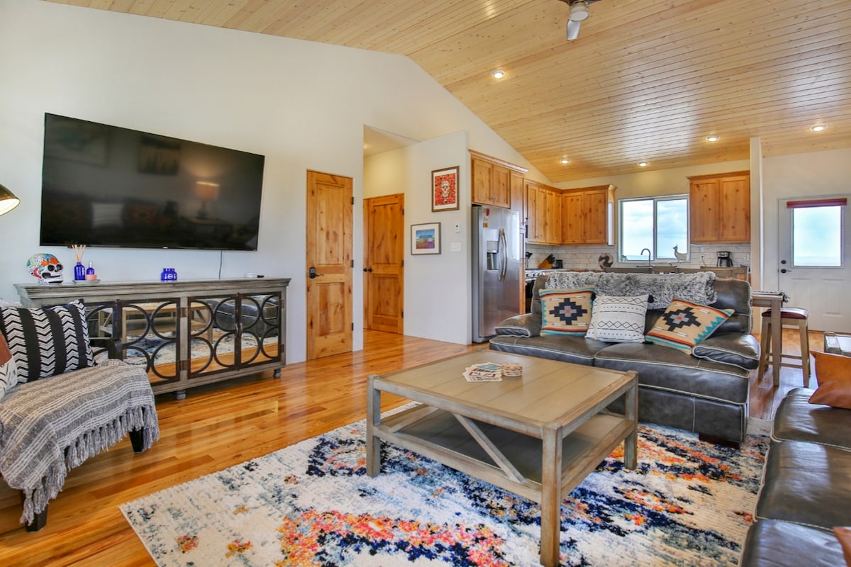 Genieße die atemberaubende 360°-Aussicht und das Gefühl der Ruhe in unserem schönen, neu gebauten Haus mit zwei Schlafzimmern und offenem Raum auf 3 Seiten des Grundstücks, auf einem Acre nur 4 Meilen von Taos entfernt. Du bekommst das Beste aus beiden Welten: Fühle dich, als wärst du weit weg von allem, während du trotzdem nur wenige Minuten von fantastischen Restaurants und Kunst entfernt bist. Weniger als 30 Meilen vom Taos Ski Valley und Angel Fire Resort entfernt. Dein perfekter Kurzurlaub wartet auf dich!