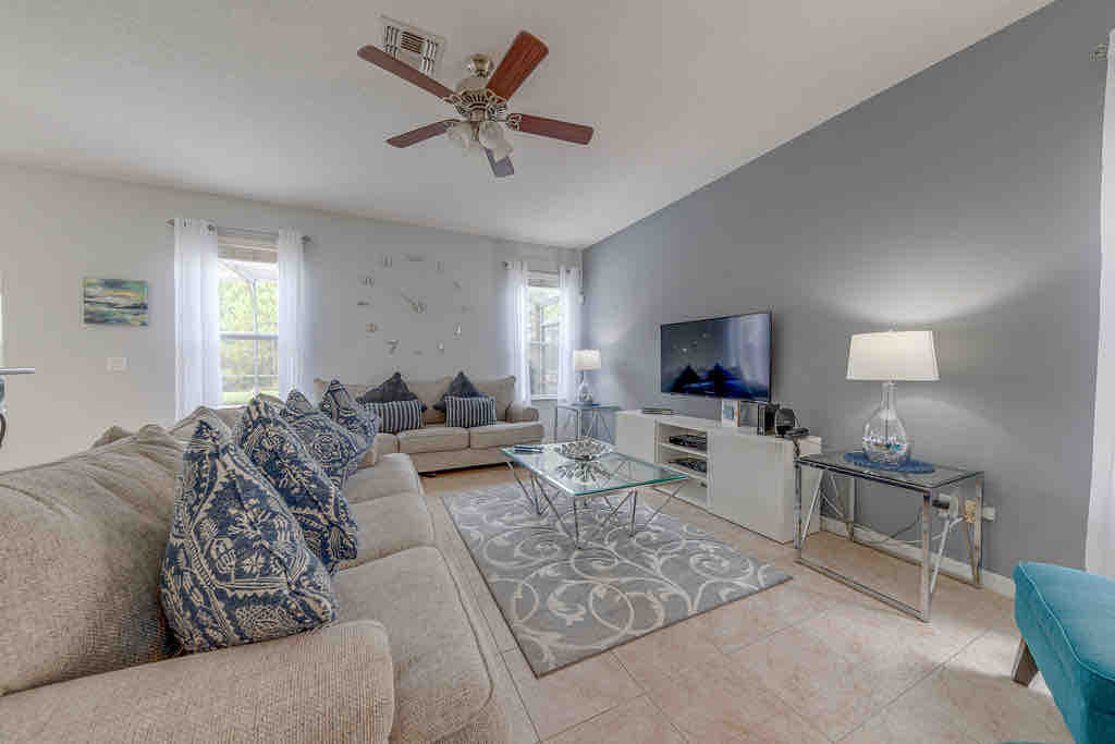 Bring die ganze Familie in dieses umzäunte Haus im Resort-Stil mit viel Platz für Spaß. Die Unterkunft verfügt über einen privaten abgeschirmten Pool mit Schwimmern, Liegestühlen, Essen im Freien und einem Gasgrill. Im Inneren 4 Schlafzimmer mit 6 Betten, 3 Badezimmern, privatem Büroraum und Spielen. Die Gemeinde bietet einen Fitnessraum, 2 Pools, einen Spielplatz, 2 Tennisplätze und einen 18-Loch Pro-Golfplatz. Nur 25 Minuten von Disney World und 40 Minuten von den Universal Studios entfernt. Einfaches Pendeln für einen unterhaltsamen Tag an einigen der besten Strände Amerikas.