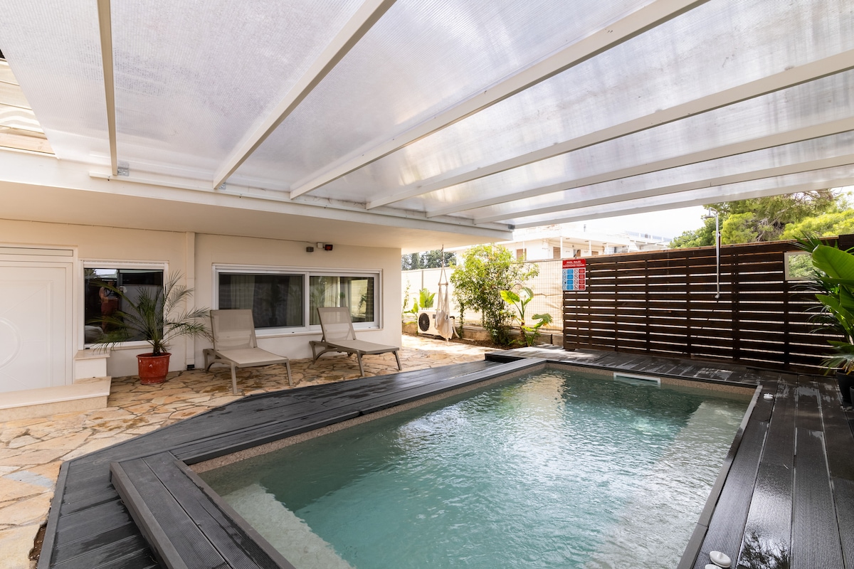 Erlebe den perfekten Loutraki-Urlaub im Rafia Loft Loutraki - einem modernen, stilvollen Haus mit privatem Pool, Whirlpool und Billard, nur 3 Gehminuten vom Strand und den Restaurants entfernt. Dieses geräumige Anwesen ist ideal für Familien und Gruppen bis zu 6 Personen und kombiniert Komfort, Unterhaltung und Bequemlichkeit für einen unvergesslichen Aufenthalt. Dies ist ein neues Inserat, die Unterkunft hat mehr als 100 sehr gut bewertete Bewertungen.