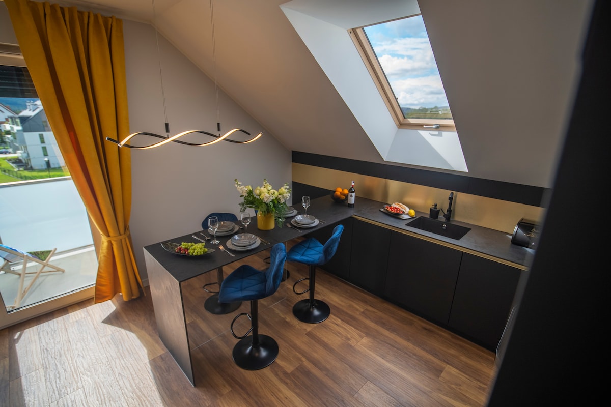 Premium-Apartment in Cieplice für max. 4 Personen, Schlafzimmer mit Doppelbett und Wohnzimmer mit Schlafsofa. Voll ausgestattete Küche, Mikrowelle, Herd, Induktionskochfeld, Kühlschrank mit Gefrierfach. Kostenlose Parkplätze und WLAN. Appartement mit herrlichem Blick auf die Berge, im 3. Stock, Gebäude mit Aufzug. Das neue Gebäude wurde im Mai 2021 in Betrieb genommen. Schön eingerichtetes Badezimmer und großer Balkon. Die Wohnung befindet sich in der Nähe der Cieplice-Thermen, des Marktplatzes von Cieplice und des Parks, ein idealer Ausgangspunkt für Ausflüge in die Berge.