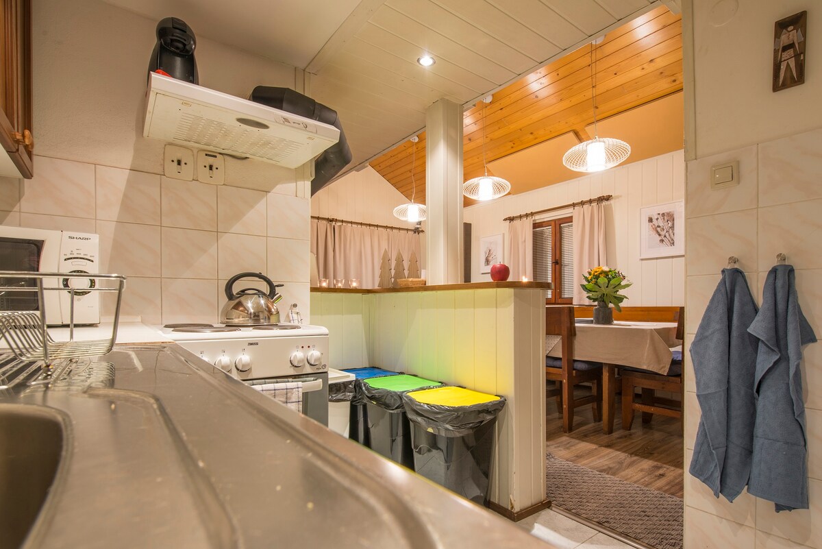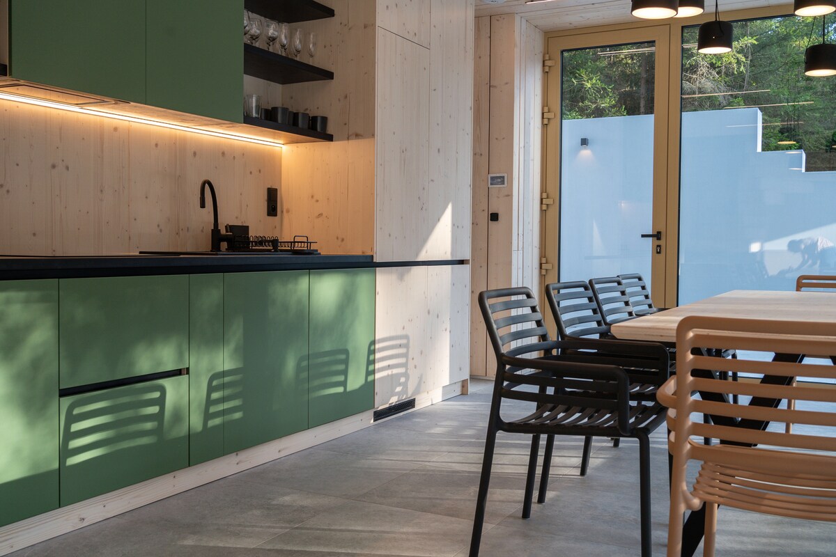 Studio-Schutzhaus mit einer Fläche von 33 Quadratmetern mit Balkon in einem erweiterten Schlafsaal, mit einem schönen Blick auf die Westliche Tatra. Geräumiges 4-Meter-Interieur mit Lärchenholz. Ein 180 x 200 cm großes Kingsize-Bett mit 2 Einzelbetten. Kochnische mit Geschirrspüler, Kühlschrank, Mikrowelle, Toaster, Kaffeemaschine. Ein 100 cm breiter, ausziehbarer Sessel macht das Studio bequem für 2 Personen oder 2 Personen mit Kind. Freiflächenbad, Toilette mit Waschbecken in separatem Raum.